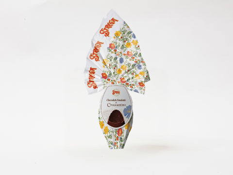 Strega firma un uovo al cioccolato fondente arricchito da granella di croccante, per un assaggio intenso e vivace.